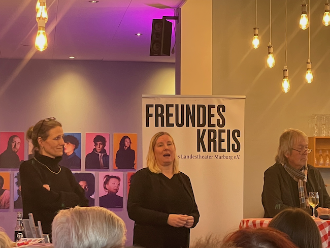 Denn das HLTM hatte nach dem "Prosit Neujahr" sein Klassenzimmerstück "Änder Leben. Malala Yousafzai und Sophie Scholl" (Uraufführung) dem Förderverein dargeboten. Im Zeichen des Spielplan Mottos "Widerstand und Liebe" hat die österreichische Autorin Anah Filou, die in Marburg seit ihrem Stück zur 800 - Jahr - Feier bekannt ist, nun zwei junge Menschen aus ganz verschiedenen Epochen zusammen auf die Bühne gebracht. Malala Yousafzai, die jüngste Friedensnobelpreisträgerin aus Pakistan, setzt sich für die Bildung von Mädchen ein und Sophie Scholl kämpfte gegen das faschistische System 1943. Zwei Schicksale getrennt durch Zeit und Raum, aber doch so nah beim friedlichen Widerstand gegen ein System. Das Klassenzimmerstück dauert 45 min, also eine Schulstunde und wird ca 45 mal in Klassenzimmern gespielt. Insofern ist es immer ein besonderer Genuss für die Förderer, die Welt aus dem Blickwinkel der Schüler*innen zu erleben. Die anschließende Diskussion mit den Intendantinnen Eva Lange, die das Stück inszenierte und Carola Unser-Leichtweiß sowie den Schauspielrinnen Saskia Boden-Dilling und Magdalena Hanetseder vom Schauspielstudio Graz gab einen vertiefenden Einblick in die Welt der Jugendlichen. Eigentlich ist das Stück ab 13 Jahre konzipiert, aber Vorstellungen vor der Klasse 3 zeigten, das auch ohne tieferes Anfangswissen ein erstaunliches Mitgefühl und Verständnis für die Problematik beim Nachgespräch sich zeigte unter den Schüler*innen.